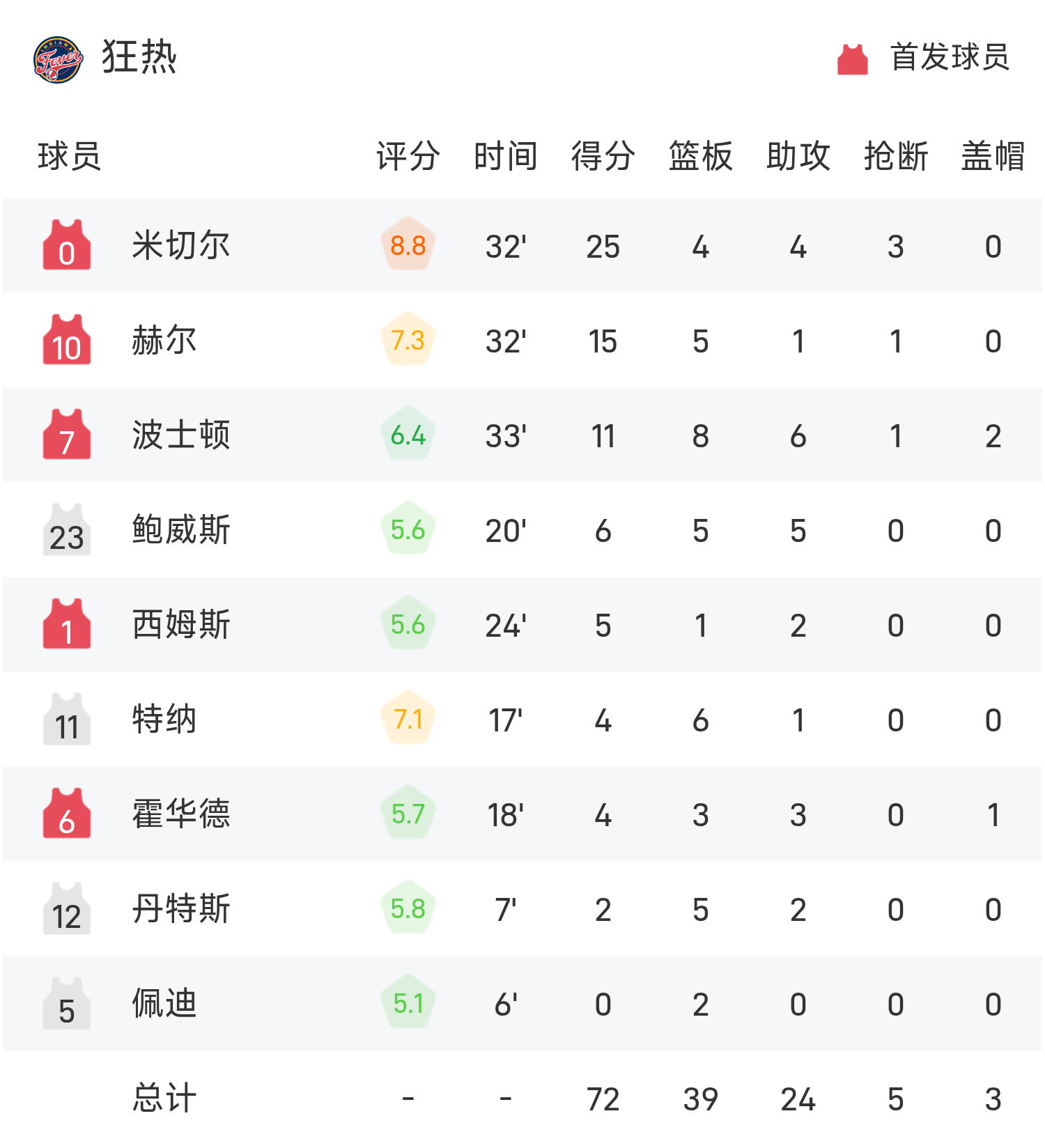 09月03日讯 25赛季WNBA常规赛,水星对阵狂热。双方全场战罢,水星85-79战胜狂热。托马斯得到22分9板9助率队取胜,米切尔空砍全场最高的25分4板4助。